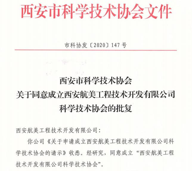 西安航美工程技術(shù)開發(fā)有限公司: 你公司《關(guān)于申請(qǐng)成立西安航美工程技術(shù)開發(fā)有限公司科學(xué)技術(shù)協(xié)會(huì)的請(qǐng)示》收悉。經(jīng)研究,同意成立“西安航美工程技術(shù)開發(fā)有限公司科學(xué)技術(shù)協(xié)會(huì)...